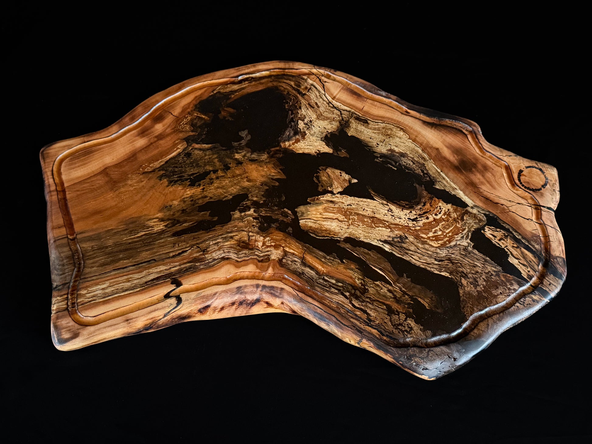 Die dunklen Adern fließen wie glühende Schatten durch das warme Apfelholz und erzeugen ein faszinierendes Spiel aus Licht und Tiefe.