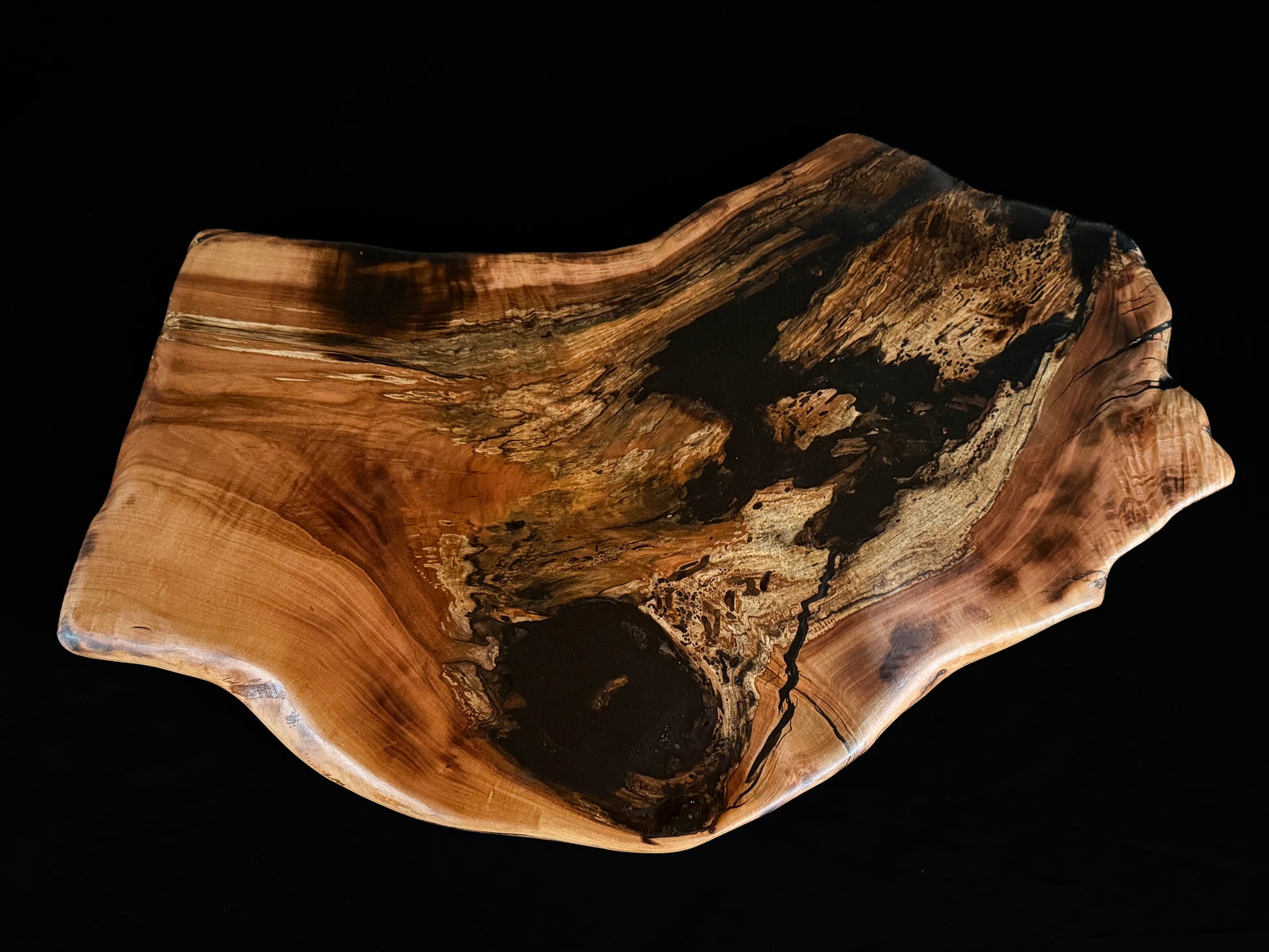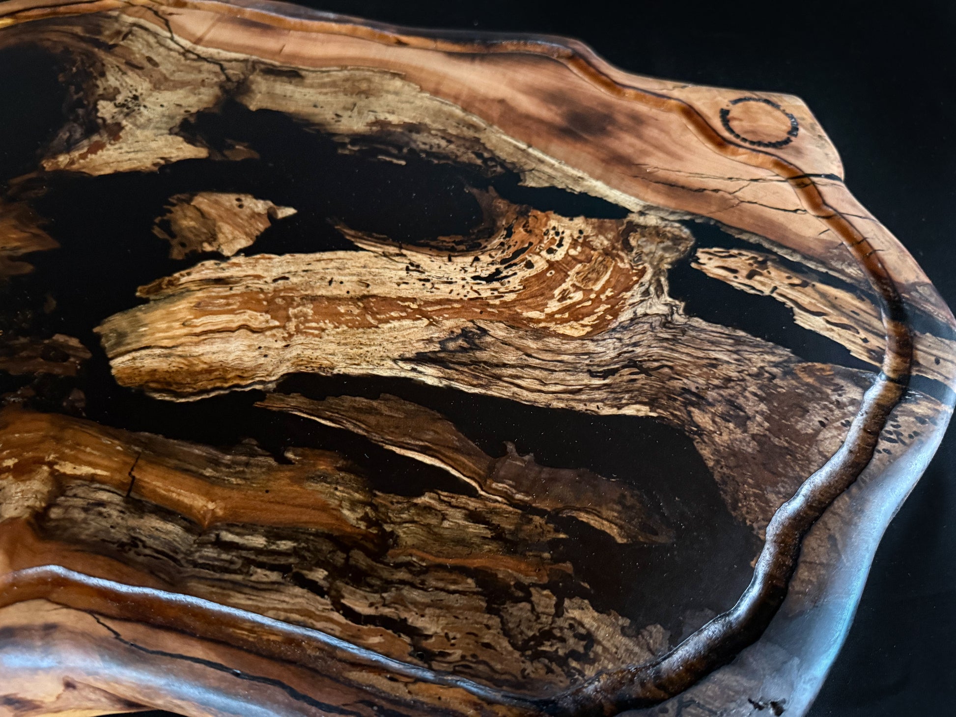 „Schattenglut“ trägt die Spuren der Zeit in sich – ein Stück Apfelholz, das im Inneren verfault war und durch geschickte Handarbeit mit schwarzem Epoxidharz restauriert wurde.
